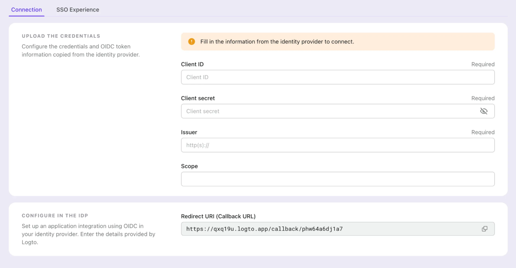 - Configure the connection with your IdP in the "Connection" tab. Check the guides above for each connector types.
