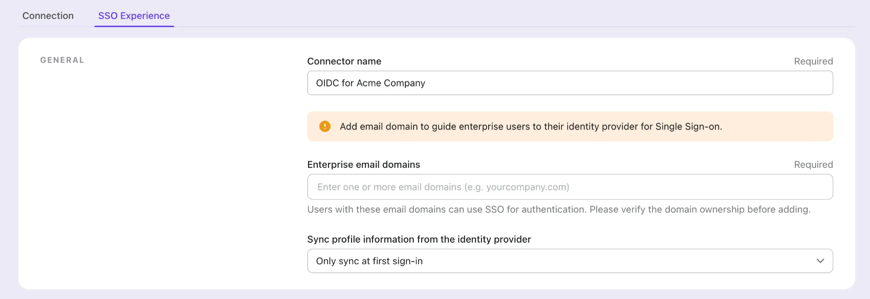 Provide the email domains of your organization on Logto’s connector SSO experience tab. This will enable the SSO connector as an authentication method for those users.