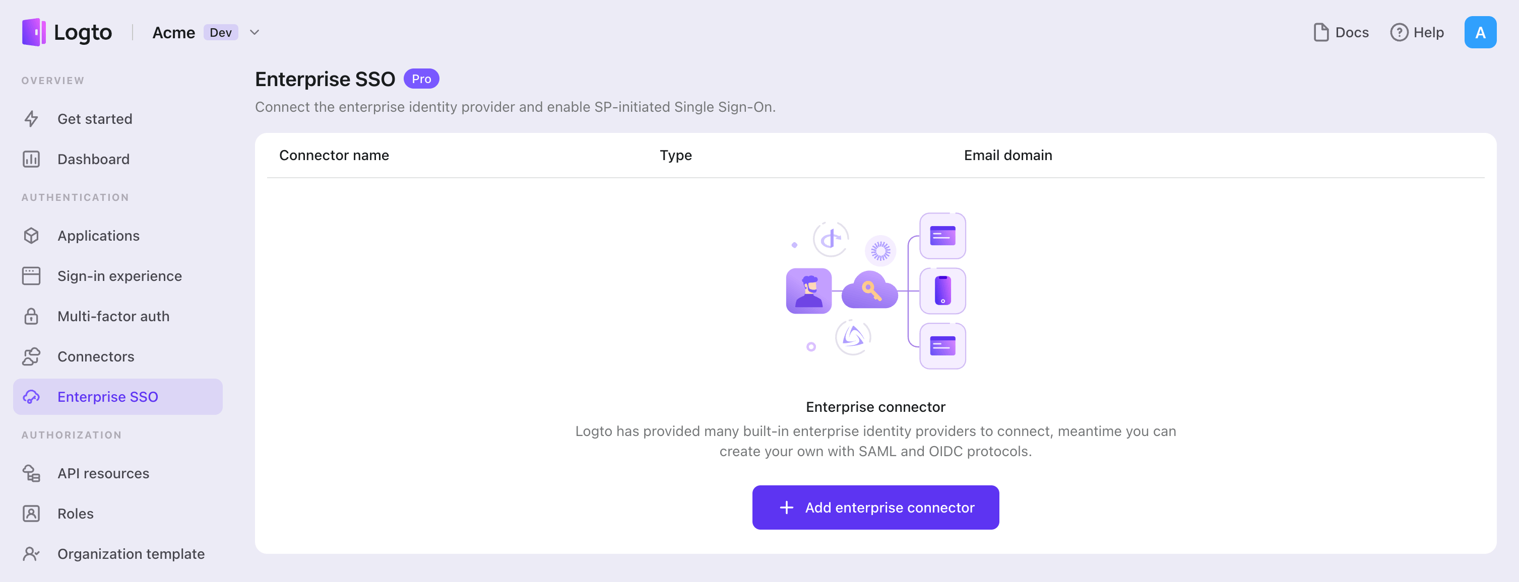 You don’t need to configure enterprise connectors individually, Logto simplifies SSO integration into your applications with just one click.